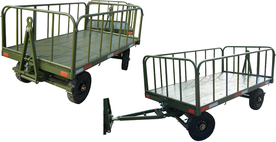 ● 采用500-8實(shí)心輪胎4只,雙轉(zhuǎn)盤(pán)轉(zhuǎn)向,可列車(chē)牽引。